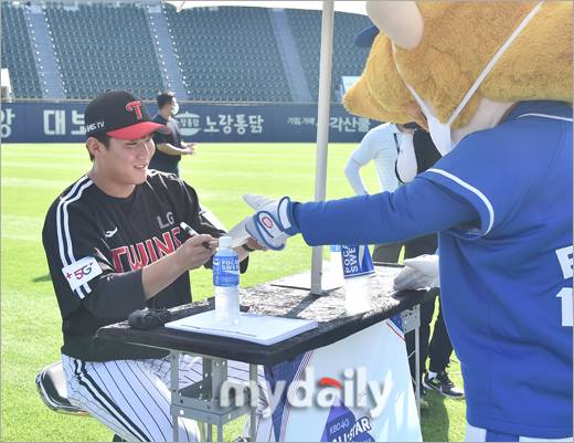 [마이데일리 = 한혁승 기자] LG 김영준 투수가 15일 오후 서울 잠실야구장에서 열린 '2022 신한은행 SOL KBO 올스타전' 퓨처스 올스타 팬 사인회에 참석해 삼성 라이온즈 마스코트 블레오에게 사인을 해줬다.