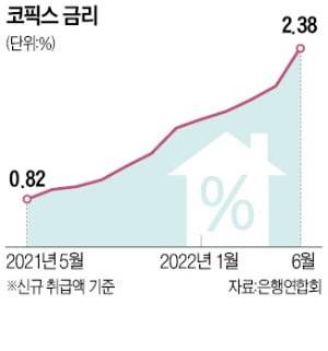 15일 은행연합회에 따르면 6월 신규 취급액 기준 코픽스는 2.38%로 한 달 전(1.98%)보다 0.4%포인트 상승했다. 2014년 7월(2.48%) 후 7년11개월 만의 최고치다. 상승폭도 2010년 1월 신규 취급액 기준 코픽스를 집계한 이후 가장 크다. 기준금리 인상이 본격화하기 전인 작년 7월 코픽스가 0.95%였다는 것과 비교하면 1년 새 두 배 넘게 뛰었다.
