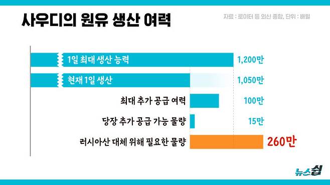 사우디가 최대로 생산할 수 있는 원유 물량은 장부상으로 하루 1천2백만 배럴이라고 한다. 하지만 실제로 생산하고 있는 건 하루 1천50만 배럴 가량이다. 1백50만 배럴이 비는데, 로이터가 전한 사우디 석유산업 고위관계자 발언에 따르면, 사우디가 실제로 늘릴 수 있는 추가생산량은 하루 최대 1백만 배럴 정도다. 그러나 이것도 예비설비 등을 포함한 숫자이고, 당장 시장에 추가공급할 수 있는 건 15만 배럴에 불과하다는 게 석유수출국기구(OPEC) 투톱인 아랍에미리트(UAE) 대통령의 전언인 것이다.