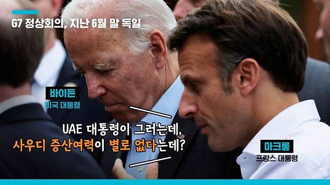 마크롱이 G7 참석 전 아랍에미리트의 모하메드 빈 자예드 대통령에게서 들었는데, '사우디 아라비아는 하루 15만 배럴 정도밖에 추가 공급을 할 수 없으며, 앞으로 6개월 정도는 이런 사정이 변하지 않을 것'이라고 하더라는 것이다.