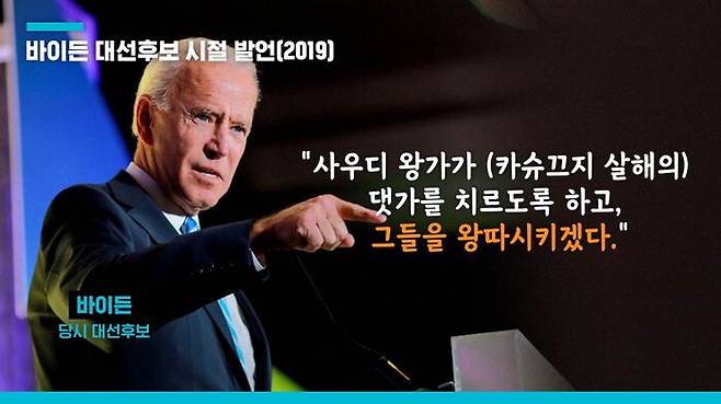 반면 바이든은 이듬해인 2019년 트럼프에 맞서 대선후보로 선거전을 치르면서, 빈 살만과 사우디 왕가에게 카슈끄지 살해의 책임을 묻고 국제사회에서 왕따시키겠다고 공언했다. 사우디가 인접국 예멘의 내전에 개입해 친 이란 세력을 몰아낸다는 명분으로 비인도적 민간인 살상을 자행한다는 것도 바이든이 빈 살만을 상종하지 않으려는 이유였다.