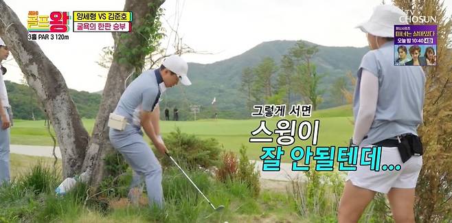설상가상 공이 나무 바로 옆 긴 풀숲에 가려져, 굉장히 까다로운 트러블샷이 요구됐다. 이에 김미현 프로가 양세형을 도와주기 위해 "그렇게 하면 뒤땅 나올 수 있다"라며 자세를 교정해주었지만, 양세형은 "이게 더 불편하다"라며 편한 자세를 고집했다.