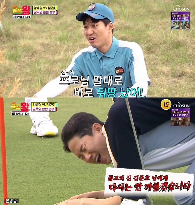 결국 이번 대결은 김준호가 승리하게 되면서, 양세형은 무릎 꿇은 상태로 "골프의 신 김준호 님에게 다시는 안 까불겠습니다"라고 외치는 굴욕을 맛봤다.