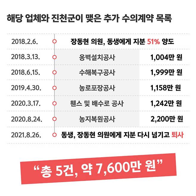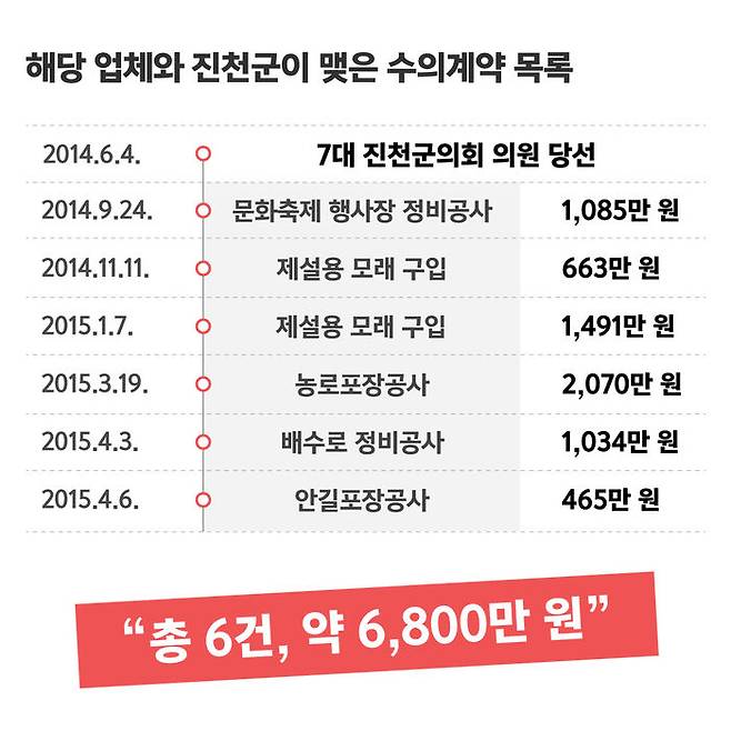 장 의원이 진천군의회 의원으로 처음 선출된 지 석 달 뒤인 2014년 9월. 장 의원 소유 건설회사는 진천군으로부터 '문화축제 행사장 정비공사' 수의계약을 따냈습니다. 다음해 4월까지 이 회사가 진천군과 맺은 수의계약은 총 6건, 6,800만 원에 이릅니다. 부당한 영향력이 개입됐는지 여부와 별개로 지방의원 소유 업체가 해당 자치단체와 수의계약을 할 수 없도록 한 지방계약법 위반입니다.