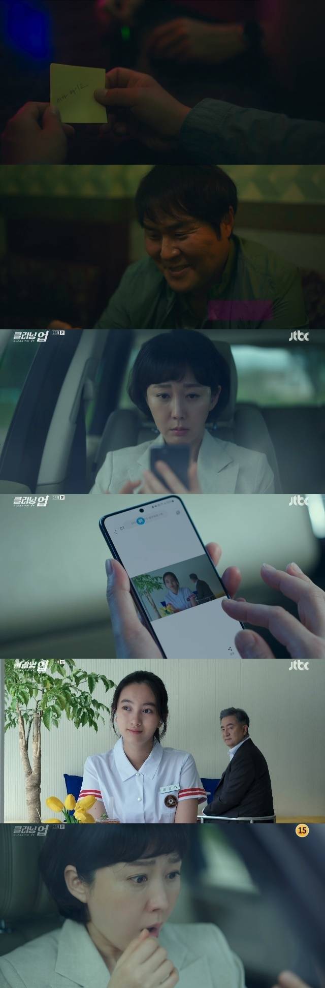 하지만 어용미가 발을 빼기엔 이미 늦었다. 갑자기 어용미에게 전송된 딸 진연아(갈소원 분)의 사진. 진연아의 뒤에는 송우창이 카메라를 응시하고 있었다. (사진=JTBC '클리닝 업' 캡처)