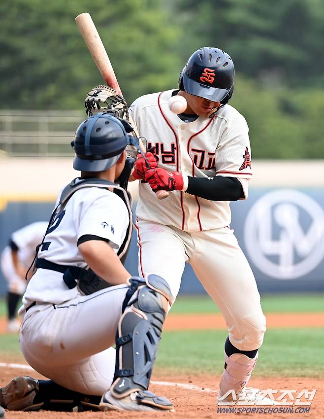 제77회 청룡기 전국고교야구선수권 대회 유신고와 성남고의 경기가 19일 목동야구장에서 열렸다. 2회초 성남고 2사 1루 나해성이 유신고 승지환의 투구를 몸에 맞고 있다. 목동=허상욱 기자wook@sportschosun.com/2022.07.19/
