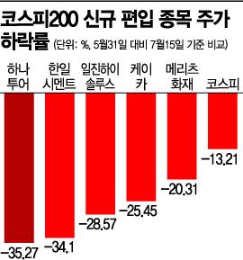 지수와 공매도의 상관관계가 깊지 않다고 해도 개별 종목으로 놓고 보면 아예 상관관계가 없다고 확언하기 어렵다. 지난달 10일 코스피200지수에 신규 편입된 종목들의 주가가 5월31일 대비 15일 기준 최대 35%까지 하락한 것으로 집계됐다. 하나투어(-35.27%), 한일시멘트(-34.10%), 일진하이솔루스(-28.57%), 케이카(-25.45%), 메리츠화재(-20.31%)의 주가는 두 자릿수 하락률을 기록했다. 같은 기간 코스피가 13.2% 떨어진 것과 비교하면 2~3배의 낙폭이다.