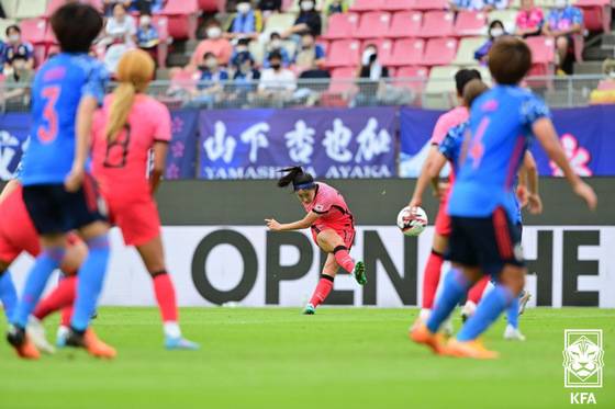 (서울=뉴스1) = 여자 축구대표팀 이영주 선수가 19일 일본 가시마 경기장에서 열린 2022 EAFF E-1 챔피언십 대한민국과 일본의 경기에서 슈팅을 날리고 있다. (대한축구협회 제공) 2022.7.19/뉴스1