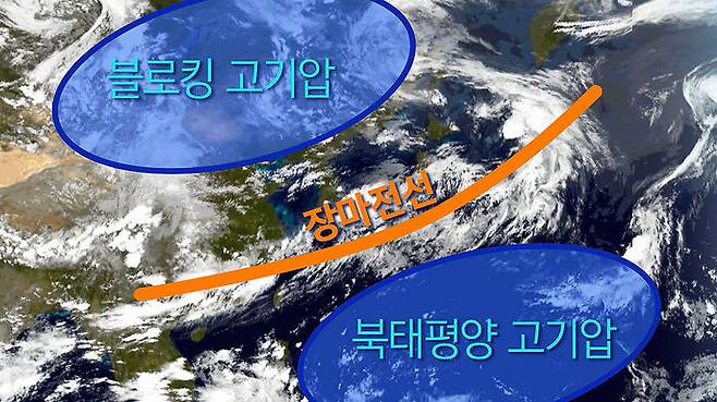 특이하게 위쪽에 자리 잡고 있는데, 그 아래로 장마전선, 밑으로는 북태평양 고기압이 보이시죠.