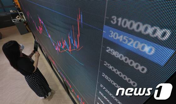 (서울=뉴스1) 조태형 기자 = 미국과 유럽증시가 급등하면서 국내 가상화폐 시장에서 비트코인이 3000만 원대를 재돌파한 20일 서울 서초구 빗썸 고객지원센터 전광판에 비트코인 시세가 나타나고 있다. 2022.7.20/뉴스1