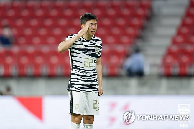 (서울=연합뉴스) 20일 일본 아이치현 도요타시 도요타 스타디움에서 열린 동아시안컵 남자부 1차전 한국-중국 전에서 권창훈이 두번째 골을 넣은 뒤 거수경례하고 있다. 2022.7.20 [대한축구협회 제공. 재판매 및 DB 금지]