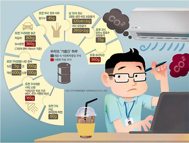 회사에 도착한 김씨는 45g의 기름 필기구를 들고 회의에 참석했다. 다시 자리에 돌아와 5g의 기름 피복으로 덮인 충전기에 연결부터 했다. 기름 에어컨에서는 계속해서 시원한 바람이 나왔고 기름 냉장고 안에는 기름으로 만들어진 15g짜리 음료수 병이 가지런히 놓여있다. 김씨는 기름 노트북으로 오전 근무를 마친 뒤 배달 아르바이트생이 112g의 기름을 쓰며 오토바이를 타고 전해준 40g짜리 기름 포장용기에 담긴 냉면을 점심으로 먹었다. 식후엔 카페에서 5g의 기름 지갑에서 5g의 기름 신용카드를 꺼내 13g의 기름 컵에 담긴 커피를 마셨다.