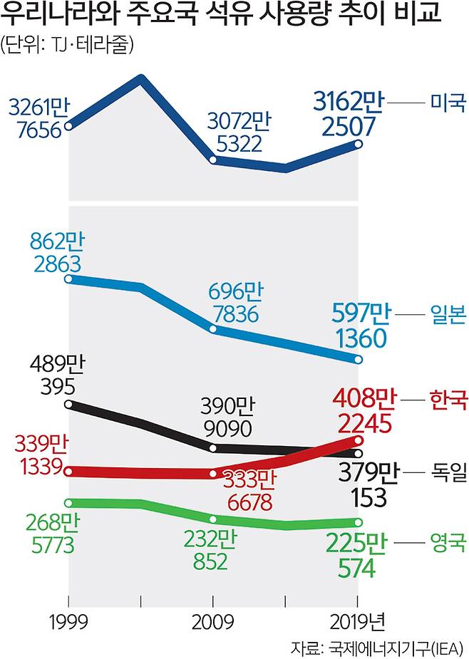 ◆유럽·일본도 주는데… 한국서만 느는 석유 소비