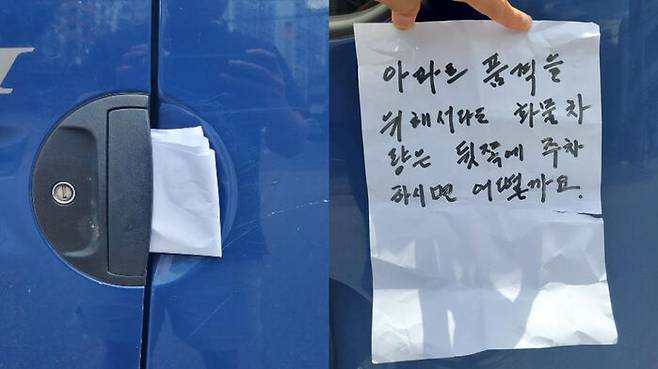 쪽지에는 "아파트 품격을 위해서라도 화물차량은 뒤쪽에 주차하시면 어떨까요"라는 내용의 메시지가 적혀 있었습니다.