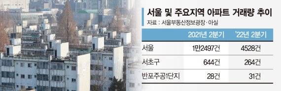 반포주공1단지가 위치한 서울 서초구의 2·4분기 아파트 매매거래량만 봐도 1년 새 59%(644건→264건) 줄어 반토막이 났다.