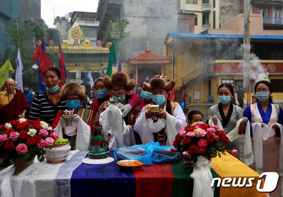 (카트만두 로이터=뉴스1) 유민주 기자 = 네팔 카트만두에서 가족과 지지자들이 산소 보충 없이 에베레스트산을 10번 오른 '눈 표범'으로 알려진 앙리타 셰르파의 장례 행렬에 참여하고 있다. 2020.09.23