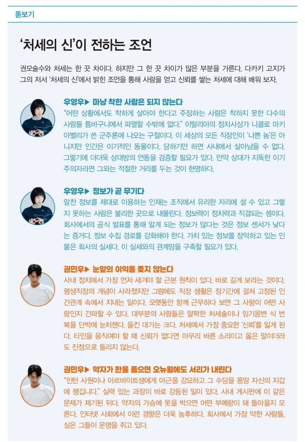 흔히 ‘일만 잘하면 되는 것 아닌가’라고 생각하기 쉽지만 여럿이 모이는 회사는 그렇게 돌아가지 않는다. 현실의 직장인이라면 능력 그 이상의 무엇이 필요하다. ‘이상적인’, ‘좋은’ 회사는 우영우나 최수연이 그들의 실력대로 인정받지만 그렇지 못한 회사는 권모술수에 능한 권민우가 더 인정 받는 경우가 흔하다.