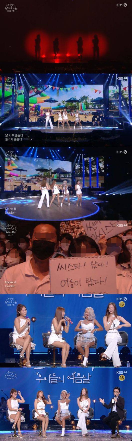 이후 씨스타는 써머송으로 많은 사랑을 받았던 히트곡 '나혼자', 'Loving U', 'SHAKE IT', 'Touch my body'를 연달아 선보여 방청객들을 환호케 했다.