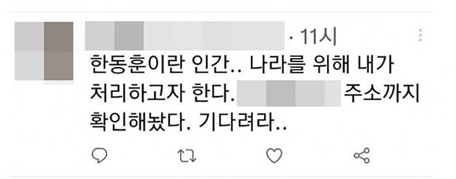 앞서 어젯밤 A 씨의 트위터 계정엔 "나라를 위해 (한 장관을) 내가 처리하고자 한다. 주소까지 확인했다"는 글이 올라와 이를 본 누리꾼들의 112 신고가 접수됐습니다.