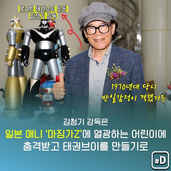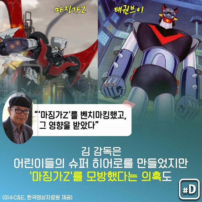 김청기 감독은 1970년대에 어린이들이 일본 애니메이션 '마징가Z'에 열광하는 것을 보고 충격을 받아 태권브이를 만들기로 했다고 해요.
