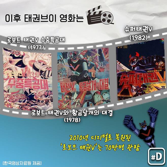 태권브이 영화는 이후 '우주작전'(1976), '수중특공대'(1977), '로보트 태권V와 황금날개의 대결'(1978), '슈퍼태권V'(1982), '84 태권브이'(1984)가 제작됐고, 1990년 실사와 애니메이션을 결합한 '로보트 태권V 90'을 마지막으로 제작이 중단됐습니다.