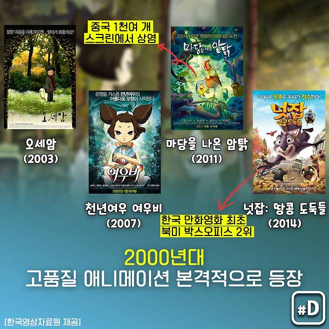 관객 220만명을 동원한 '마당을 나온 암탉'은 중국 1천여 개 스크린에서 상영됐고, '넛잡: 땅콩도둑들'은 한국 만화영화 최초로 북미 박스오피스 2위까지 올랐죠.