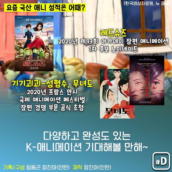 '레드슈즈'는 지난해 아카데미 장편 애니메이션 1차 후보에 이름을 올렸고, '기기괴괴 성형수'와 '무녀도'는 2020년 프랑스 안시 국제 애니메이션 페스티벌 장편 경쟁부문에 공식 초청되기도 했죠.