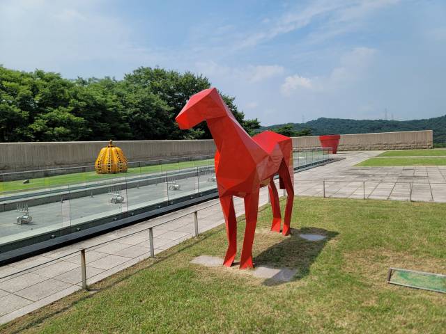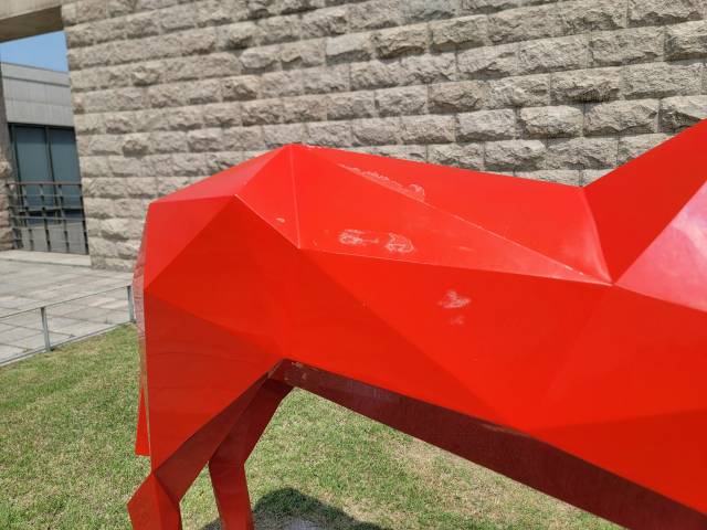 ◇90억 원대 ‘호박’도 벗겨져=과천관 야외조각 전시장에 설치된 일본 미술가 구사마 야요이의 노란색 ‘호박’ 조각의 검정색 물방울무늬 자리에 성인 엄지손톱보다 큰 허연 이물질이 묻어 있다. 비슷한 크기(지름 180㎝)의 노란 ‘호박’이 2017년 크리스티 홍콩경매에서 약 93억 원(711만 달러, 수수료 포함)에 낙찰된 고가 미술품이다. ‘호박’ 맞은편 프랑스 조각가 자비에르 베이앙의 붉은색 ‘말’은 표면 군데군데 칠이 들뜨고 벗겨졌다. 장 피에르 레이노의 ‘붉은 화분’도 하단에 검게 긁힌 자국이 고스란히 노출됐다. 한곳에 모인 주요 작품 3점 모두가 훼손된 상태다. 미술관 측은 “정기적으로 야외 조각품을 관리하고 있다”고 했으나 세금으로 운영하는 국가대표 미술관의 작품 관리라고 하기 힘들 정도다. 비바람에 노출된 야외 조각의 특수성을 감안하더라도 말이다.