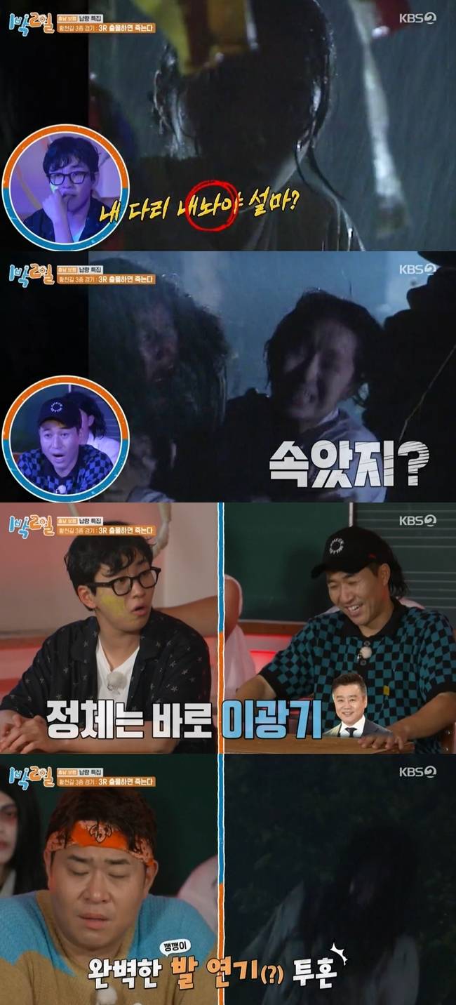 이후 이정규PD는 "'내 다리 내놔' 님이 누군지 아냐"고 물은 뒤 이광기라는 사실을 밝혀 모두를 놀라게 했다. 이광기는 완벽한 발연기 투혼으로 감탄을 자아냈다. (사진=KBS 2TV '1박2일 시즌4' 캡처)