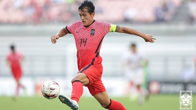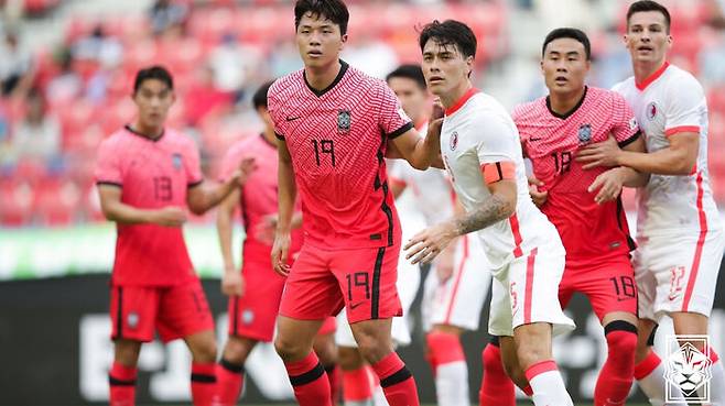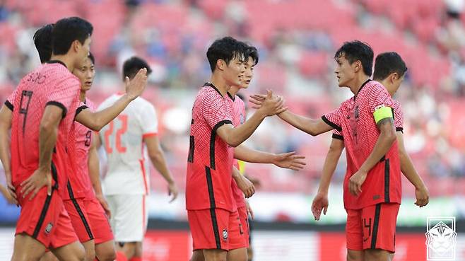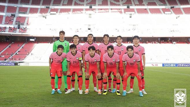 24일 일본 아이치현 도요타 스타디움에서 열린 2022 동아시안컵 남자부 2차전 홍콩과의 경기에 앞서 한국 선수들이 기념 촬영하고 있다.
