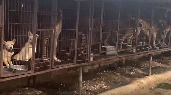 뜬장 안에는 갈비뼈가 훤히 드러날 정도로 야위어 아파하거나, 뒤섞인 음식물 쓰레기를 먹는 개들이 보였다고 단체는 설명했습니다.