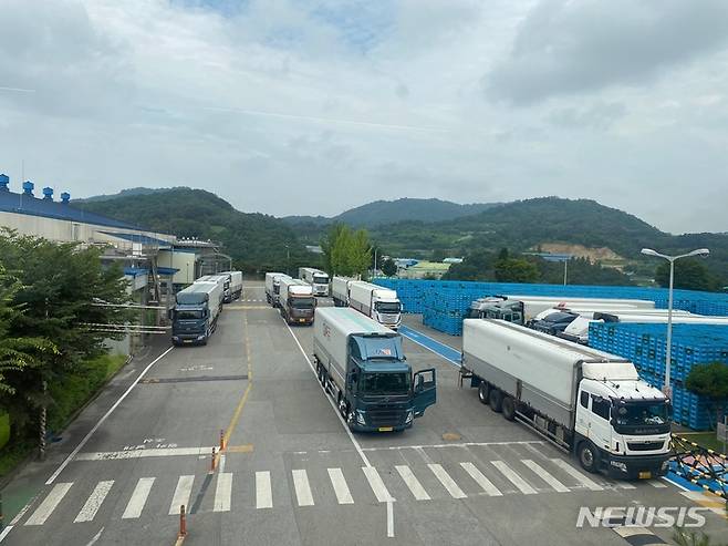 [서울=뉴시스] 김동현 기자 = 전국민주노동조합총연맹(민주노총) 공공운수노조 화물연대본부의 하이트진로 이천공장 앞 도로 완전 점유 파업으로 지난 23일부터 중단됐던 소주 출고가 25일부터 정상화됐지만 아직까지 소주 출고 중단의 불씨는 남아 있다는 지적이다.