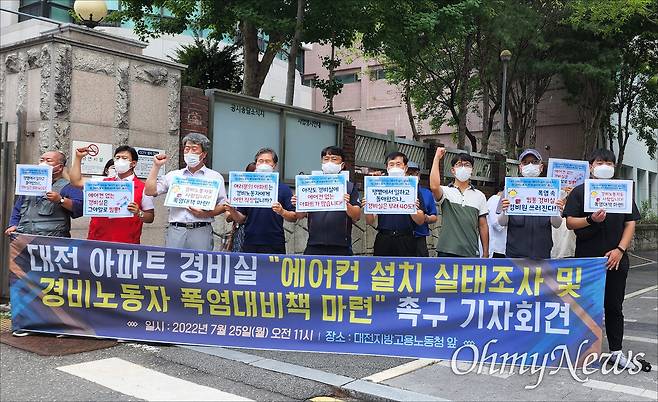 대전지역 15개 단체와 정당 등으로 구성된 대전아파트경비노동자권리찾기사업단(이하 권리찾기사업단)과 대전세종지역서비스노동조합 대전경비관리지부(이하 대전경비관리지부)는 25일 대전고용노동청 앞에서 '대전 아파트 경비실 에어컨(냉방기) 설치 실태조사 및 경비노동자 폭염 대비책 마련 촉구 기자회견'을 열었다.