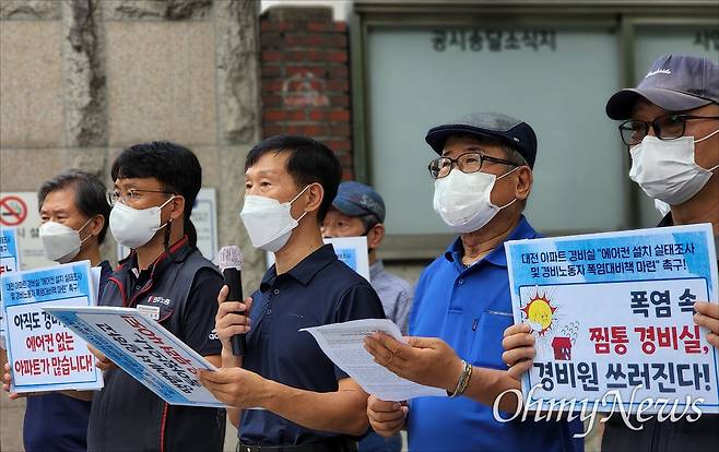 이날 기자회견에서 현장 발언에 나선 강영도 대전경비관리지부 부지부장은 "뙤약볕이 내리쬐는 한여름의 경비실은 말 그대로 찜통이다. 수많은 경비노동자들이 부채와 선풍기로 여름을 보내고 있다"며 "연신 땀을 닦아낸 손수건은 반나절이면 흠뻑 젖어버리고, 근무복은 소금기가 허옇게 묻어 나온다"고 설명했다.