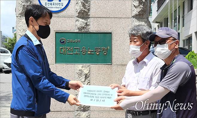 | ▲ 대전아파트경비노동자권리찾기사업단과 대전세종지역서비스노동조합 대전경비관리지부는 25일 대전고용노동청 앞에서 기자회견을 열고 "노동청은 아파트 경비실 에어컨 설치 실태조사를 즉각 실시하고, 경비노동자 폭염 대비책을 마련하라"고 촉구했다. 사진은 기자회견을 마친 후 대전고용노동청에 요청서를 전달하는 장면. |