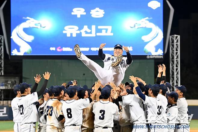 제77회 청룡기 전국고교야구선수권 대회 결승전 충암고와 유신고의 경기가 25일 목동야구장에서 열렸다.유신고가 승리하며 청룡기 우승을 차지했다. 유신고 홍석무 감독이 행가레를 받고 있다. 목동=허상욱 기자wook@sportschosun.com/2022.07.25/