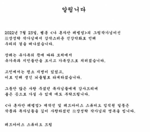‘나 혼자만 레벨업’의 제작사이자 故 장 작가가 대표를 역임하기도 한 레드아이스튜디오 측은 25일 “장 작가가 갑작스러운 건강악화로 인해 우리의 곁을 떠났다”면서 “장례는 유가족 뜻에 따라 모처에서 가족장으로 치러졌다”고 전했다.