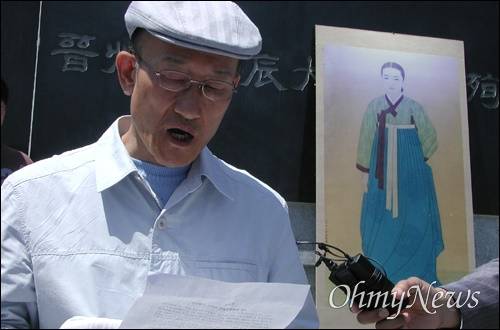 | ▲ 고 박노정 진주시민단체협의회 공동대표가 2005년 5월10일 의기사에서 일명 '논개영정'을 뜯어낸 뒤 임진계사순의단에 세워놓고 고유문을 낭독하고 있다. |