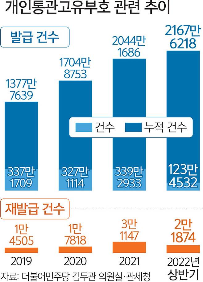 흔히 ‘통관번호’로도 불리는 개인통관고유부호는 통관 시 물품을 수입하는 사람이 누군지 식별하는 정보로, 주민등록번호 대신 쓴다. 주민등록번호 유출 및 도용을 막기 위해 2011년 도입됐고, 2019년부터 150달러(미국은 200달러) 이하 물품을 직구할 때 의무적으로 제출하게 되면서 이용자가 급증해 2022년 6월 말 기준 개인통관고유부호 발급 건수는 2167만6218건에 달한다.