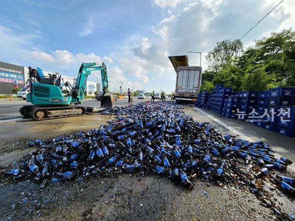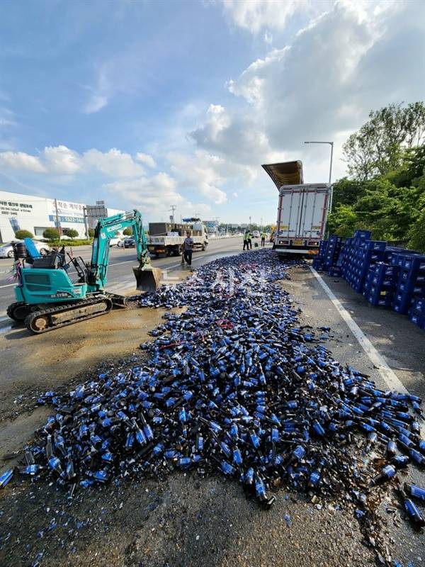 국도변에 쏟아진 맥주병 수천 개.. 2시간 도로 정체