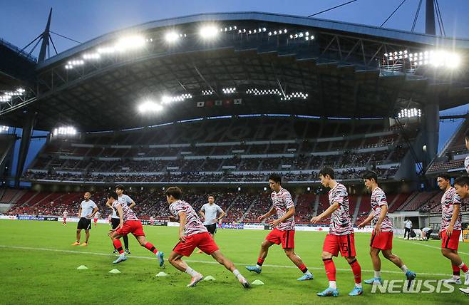 [나고야(일본)=뉴시스] 권창회 기자 = 27일 오후 일본 아이치현 도요타 스타디움에서 열린 2022 동아시아축구연맹(EAFF) E-1 챔피언십(동아시안컵) 3차전 대한민국과 일본의 경기를 앞두고 대한민국 대표팀 선수들이 훈련하고 있다. 2022.07.27. kch0523@newsis.com