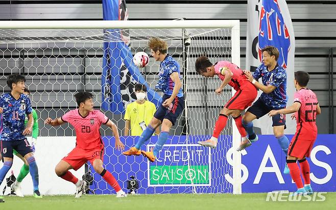 [도요타(일본)=뉴시스] 권창회 기자 = 27일 오후 일본 아이치현 도요타 스타디움에서 열린 2022 동아시아축구연맹(EAFF) E-1 챔피언십(동아시안컵) 3차전 대한민국과 일본의 경기, 일본 사사키가 헤딩으로 추가득점 하고 있다. 2022.07.27. kch0523@newsis.com