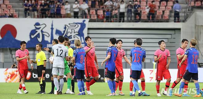 [도요타(일본)=뉴시스] 권창회 기자 = 27일 오후 일본 아이치현 도요타 스타디움에서 열린 2022 동아시아축구연맹(EAFF) E-1 챔피언십(동아시안컵) 3차전 대한민국과 일본의 경기, 3대 0으로 진 대한민국 선수들이 일본 선수들과 악수하고 있다. 2022.07.27. kch0523@newsis.com