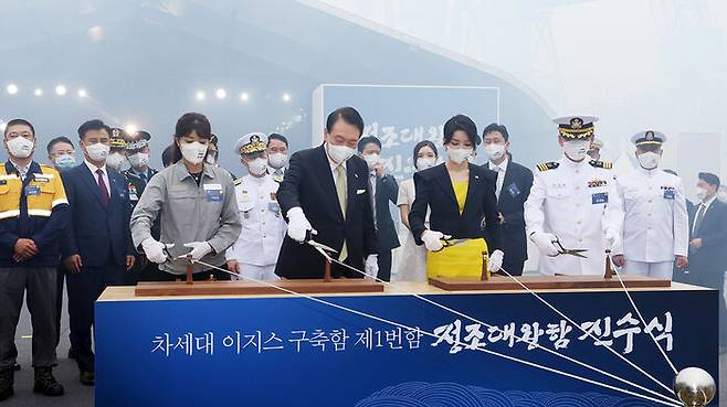 윤 대통령은 축사에서 "이제 우리는 첨단 기술이 집약된 세계 최고의 이지스 구축함을 우리의 기술로 만들게 됐다"며 "세계 최고 수준의 차세대 이지스 구축함 제1번함인 정조대왕함을 진수하는 뜻깊은 날"이라고 밝혔습니다.