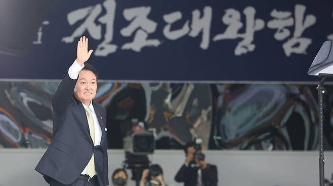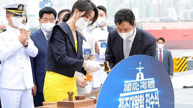 윤석열 대통령 부부는 오늘(28일) 해군의 첫 8천200t급 차세대 이지스 구축함인 정조대왕함 진수식에 참석했습니다.
