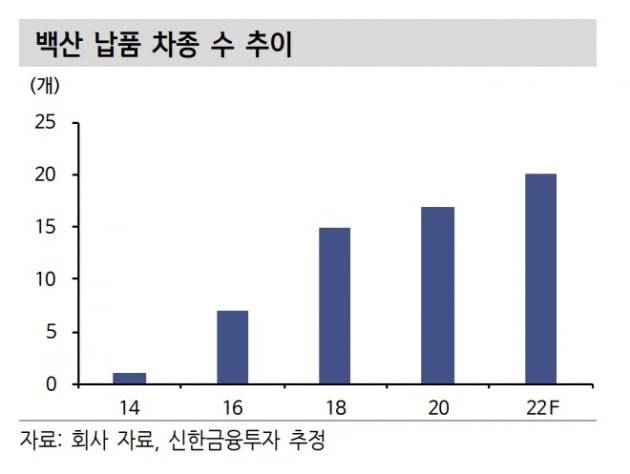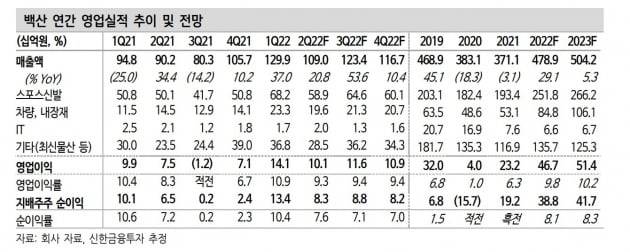 글로벌 신발용 합성피혁 시장에서 백산(2위)의 점유율도 늘어나고 있는 추세다. 황 연구원은 "1위인 대만 산팡사와 점유율 차이가 점점 줄어들고 있다"며 "3년 내 신발용 합성피혁 부문에서 글로벌 1위 등극도 노려볼 수 있는 상황"이라고 말했다.