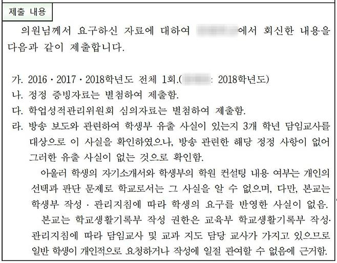 | ▲ 박순애 교육부 장관 아들이 다닌 것으로 알려진 A고가 지난 23일 국회 교육위 강민정 의원에게 보낸 답변서. |