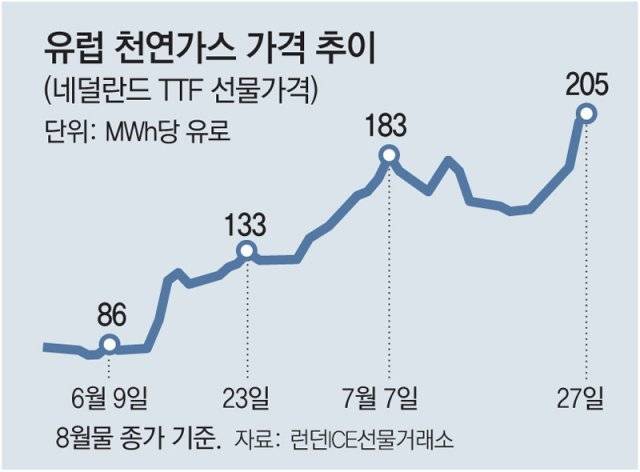 미국 정치전문매체 폴리티코 유럽판에 따르면 유럽 천연가스 기준가로 삼는 네덜란드 TTF 천연가스 현물 가격(8월물)이 이날 오전 9시 22분 메가와트시(MWh)당 228유로(약 30만3000원)로 6일 연속 상승했다. 전날 종가(199유로) 대비 15%가량 올랐다. 1년 전(22.97유로)보다는 약 10배로 뛰었다. 영국 파이낸셜타임스(FT)에 따르면 전날 독일 벤치마크 에너지 가격도 가스값 급등 영향으로 MWh당 370유로를 기록해 최고치를 경신했다.