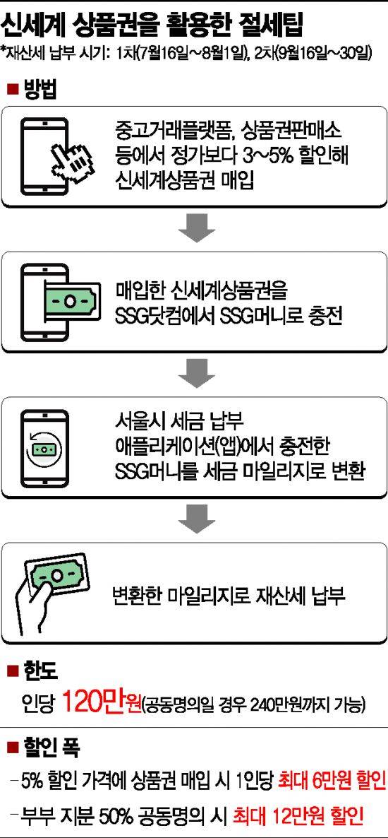 서울시에서 재산세를 납부해야 하는 사람은 신세계 상품권을 중고 거래 플랫폼이나 사설 상품권 거래소를 통해 시세보다 3~5% 정도 싸게 구매한 후 이마트 애플리케이션(앱)에서 상품권을 SSG머니로 전환해 등록하면 된다.