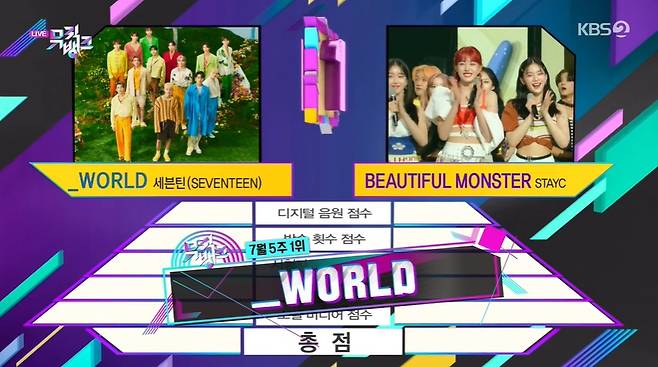 29일 방송된 KBS 2TV 음악 프로그램 '뮤직뱅크'(이하 '뮤뱅')에서 세븐틴의 'World'와 스테이씨의 'Beautiful Monster'가 7월 마지막 주 1위 후보에 오른 가운데, 세븐틴이 트로피를 거머쥐었다. 이날 세븐틴은 공식 활동 종료로 출연하지 않았다.